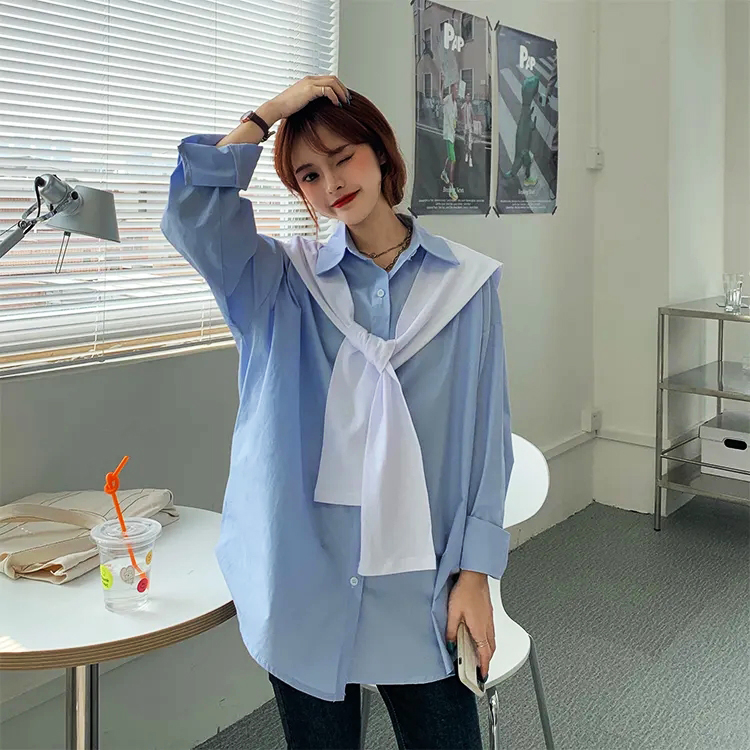 蓝色衬衫女夏薄款设计感小众宽松时尚韩版小个子长袖衬衣送披肩热门设计联盟服务商