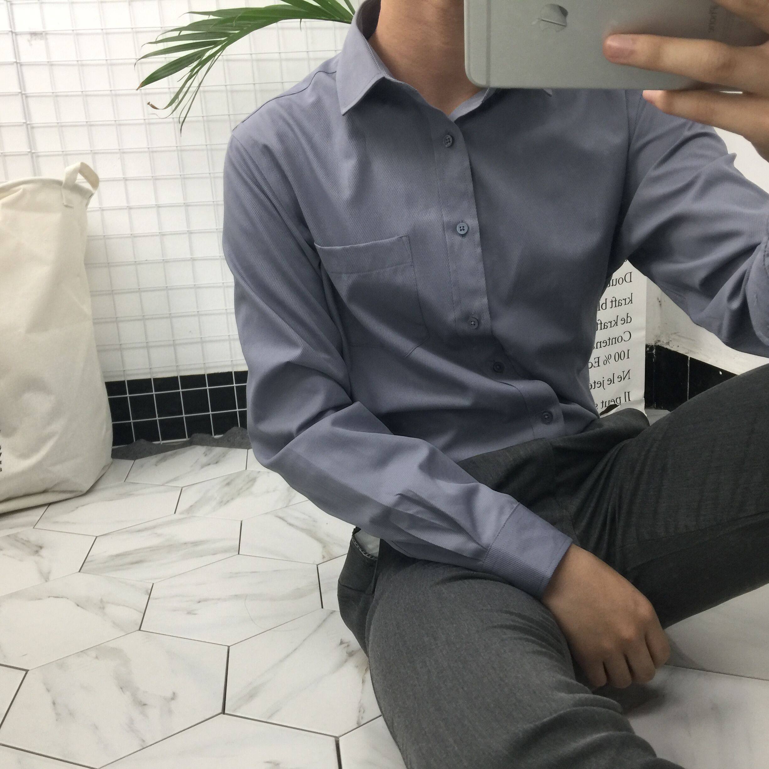 韩版修身长袖方领衬衫男纯色休闲商务复古大码男生衬衣潮热门设计联盟服务商