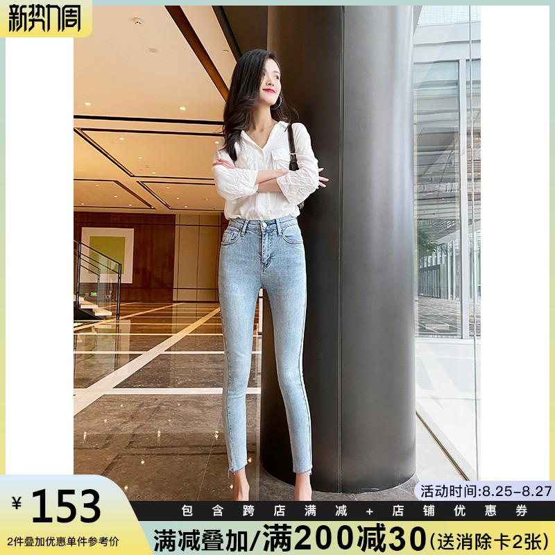2017春韩版欧洲站浅色膝盖破洞牛仔裤女力显瘦九分小脚铅笔裤子